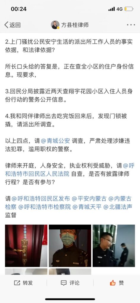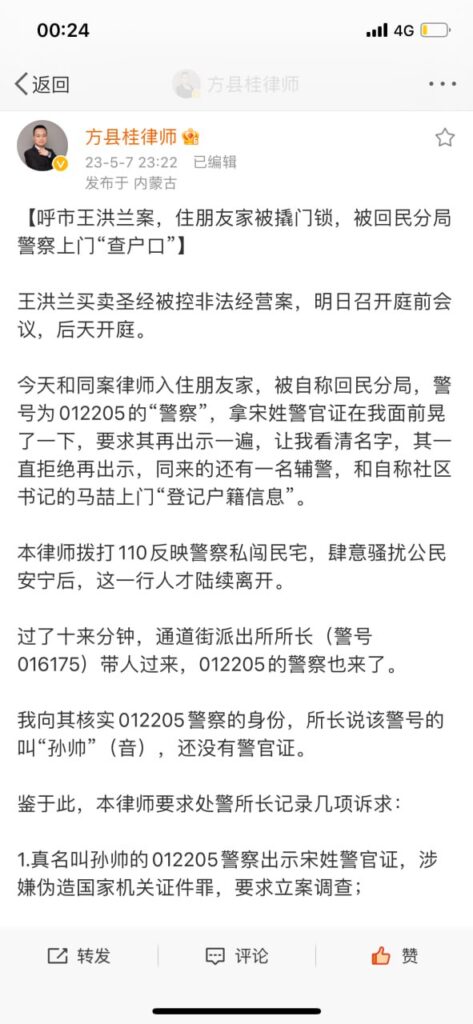 基督徒方县桂律师代理了呼和浩特王洪兰买卖圣经被控非法经营案,开庭前入住呼市一朋友家被撬门锁,被回民分局警察上门查户口。