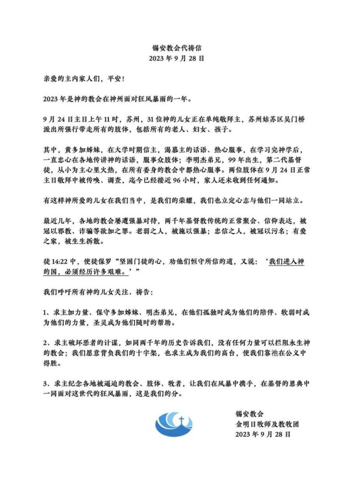 其中,黄多加姊妹,在大学时期信主,渴慕主的话语、热心服事,在学习完神学后,一直忠心在各地传讲神的话语,服事众股体;李明杰弟兄,99 年出生,第二代基督徒,从小为主心里火热,在所有委身的教会中都热心服事。两位肢体在9月24 日正常主日敬拜中被传唤、调查,迄今巴经接近96小时,家人还未收到任何通知。