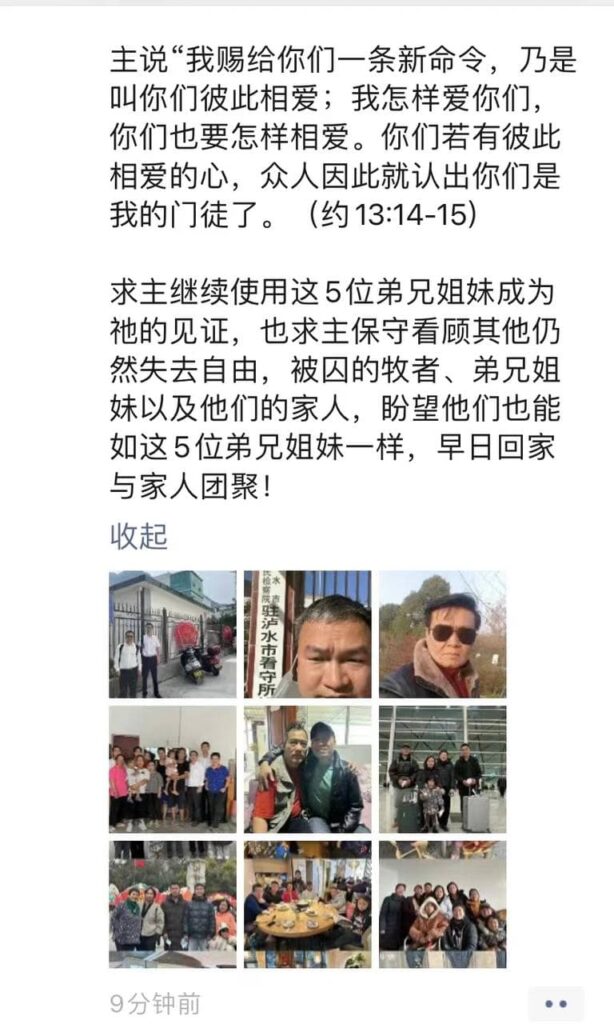 求主继续使用这5位弟兄姐妹成为祂的见证,也求主保守看顾其他仍然失去自由,被囚的牧者、弟兄姐妹以及他们的家人,盼望他们也能如这5位弟兄姐妹一样,早日回家与家人团聚!
