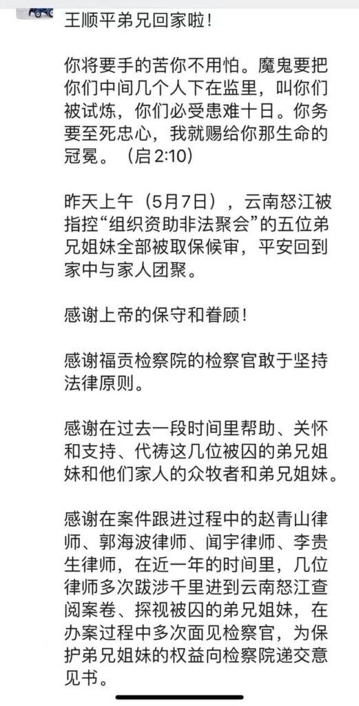 昨天上午(5月7日),云南怒江被指控“组织资助非法聚会”的五位弟兄姐妹全部被取保候审,平安回到家中与家人团聚。