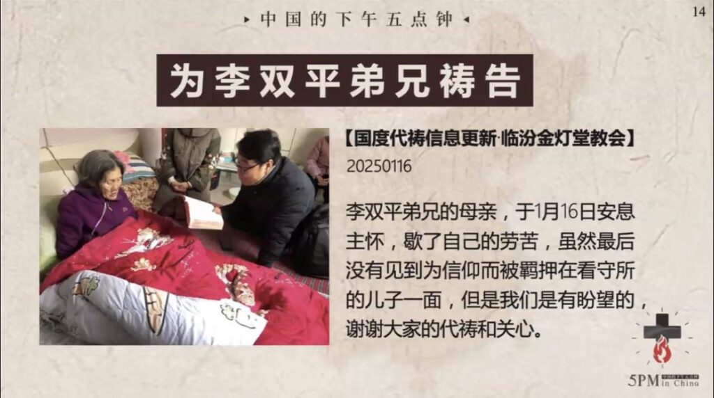 2025年1月16中午得到的消息:李双平弟兄的母亲刚刚去世了,安息主怀了!