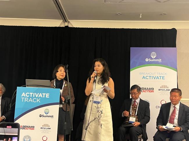 遭非法关押2年、监外执行5年的贵阳活石教会的张秀红执事在国际宗教自由峰会的专场上作受逼迫的见证。