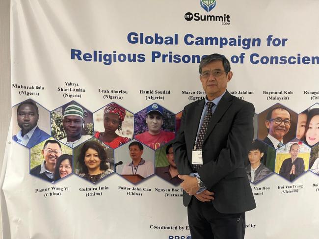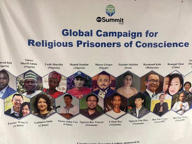 国际宗教自由大会现场悬挂著全球遭受宗教迫害人士的横幅,其中有遭关押的王怡牧师和虽已释放但仍遭监控的曹三强牧师。