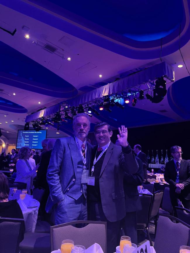 洪予健牧师在祷告会上惊喜遇见加拿大著名保守派旗手乔丹·彼得森(Jorden Peterson)博士。