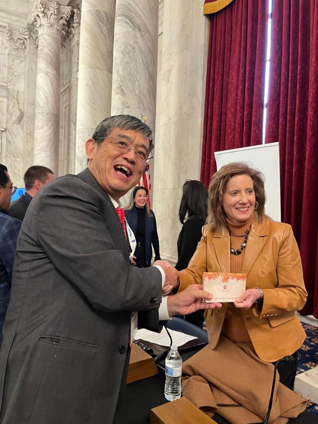 洪予健牧师将秋雨教会“中国下午五点钟祷告会”所列举遭逼迫的教牧和肢体的名单面交给Vicky Hartley专员。Vicky是美国国会议长约翰逊任命的中国宗教自由专属官员。
