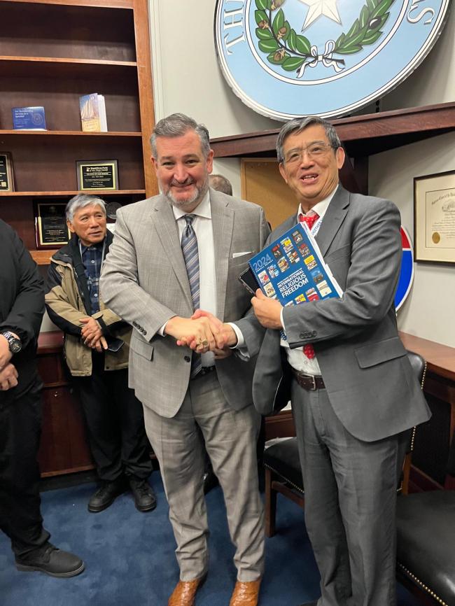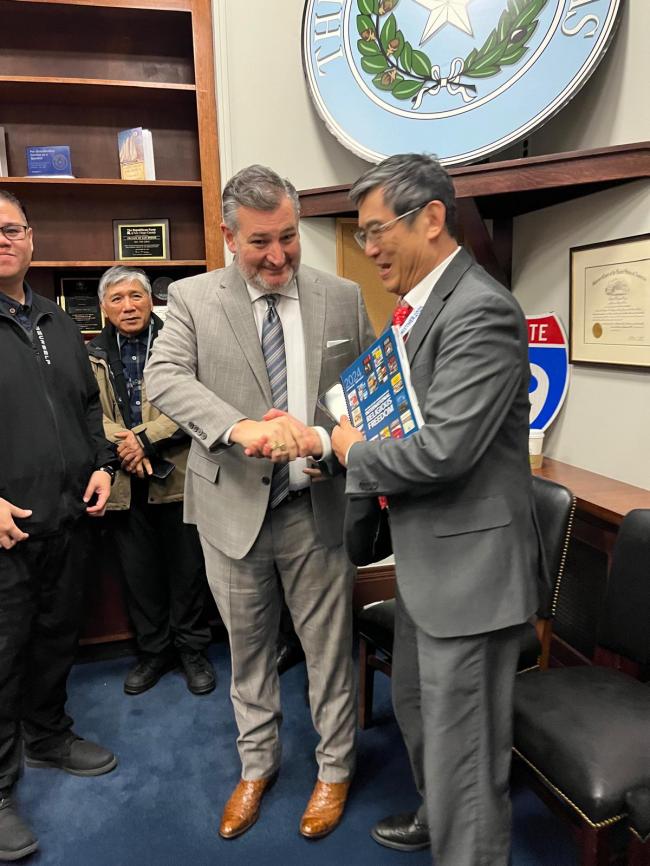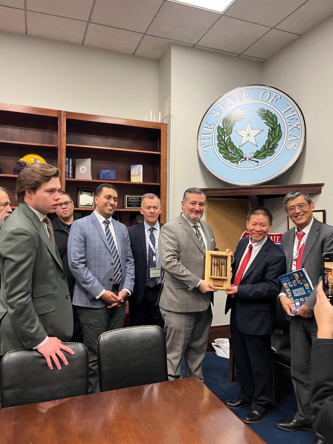 傅希秋牧师、洪予健牧师等一同拜访了德克萨斯州共和党参议员克鲁兹(Ted Cruz),并受到热情接待。克鲁兹称他和中国受逼迫的基督徒心心相印 — 因为不但他父母是从共产古巴逃来美国的,他自己也列于中共的打压名单中。