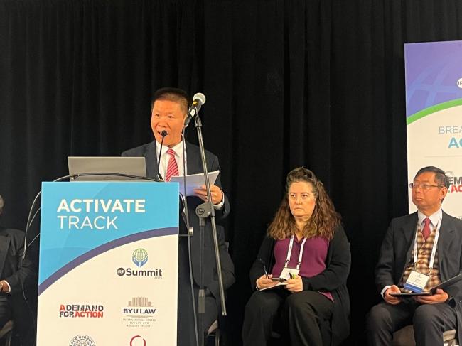 对华援助协会会长傅希秋牧师在国际宗教自由峰会的专场上报告中国家庭教会遭逼迫的现状。