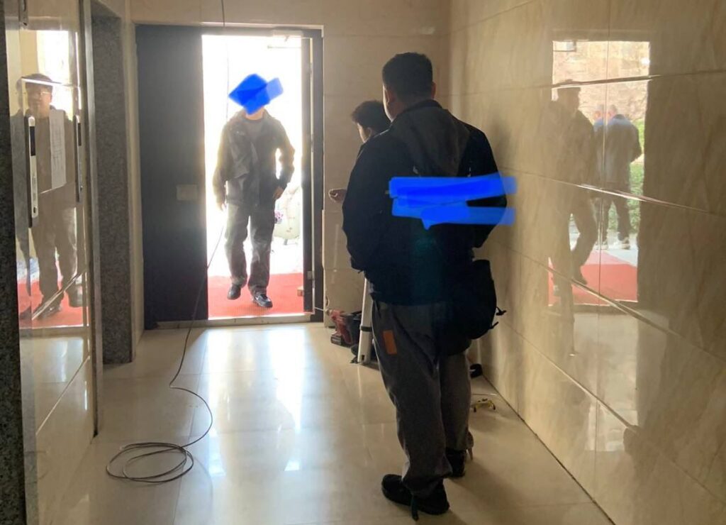 1楼电梯口,3个男人一直在火急火燎地安装监控。我和孩子只要出门,这些蹲守在门口的人就齐刷刷的拿手机摄像头对准我们。