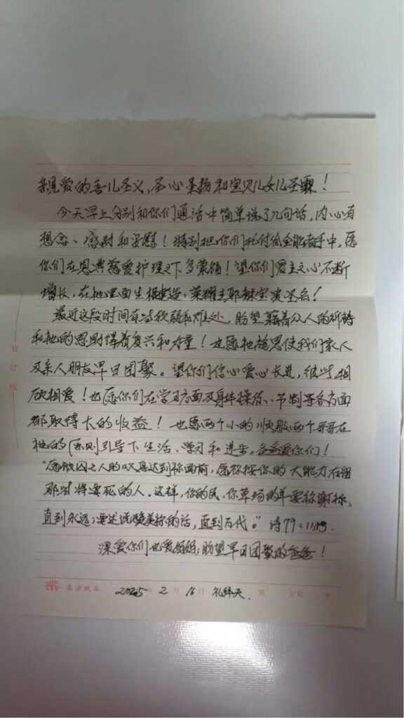 李琛慧原来在监狱厨房工作,虽然工作繁重很辛苦,但每个月可以写两封信给家人,有3-4次与家人通电话的机会。然而她在2023年10月被无故扣上“违反监规”转移到严管监区,每个月与家人的视频会面和电话都被取消,李琛慧写的信很多都寄不出来,儿女们写给她的信很多也到不了她手里。李琛慧的孩子们整个2024 年只收到母亲寄来的两封信,接到两三次电话,每次都是两分钟就挂掉了;今年没有收到过母亲的来信。孩子们多次申请视频会面和电话通话,都无回复。直到去年十月,监狱方答复说你们不要再申请了,你们案件的性质你们知道,不会批准的。