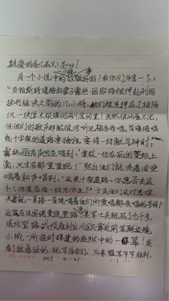 常圣义弟兄与义工Lin姊妹分享刚刚收到的父亲来信,我们看到常玉春弟兄在艰难的环境中仰望神,坚贞不渝的信仰。恳请大家为常玉春、李琛慧夫妇祷告。