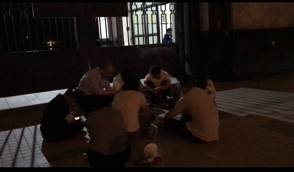 21:00我们陪五清传道来到一期门口,物业四大年轻小子(明)和一些社区网格人员(暗)拿着鸡毛当令箭,还是不让他进。我们交涉、祷告、等候。
