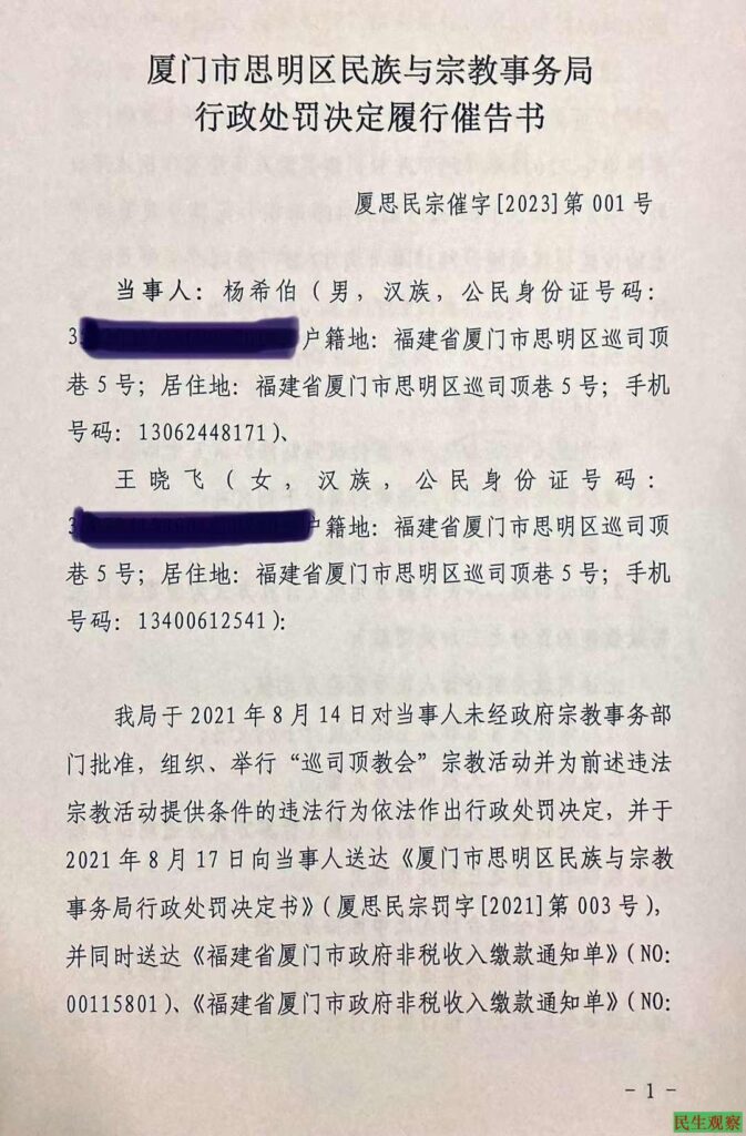 2023年6月26日,福建厦门思明区宗教局向厦门巡司顶教会杨希伯、王晓飞夫妇下达了《行政处罚决定履行催告书》,他们夫妻俩的罚款已经从10万罚款加处到20万,合计40万。