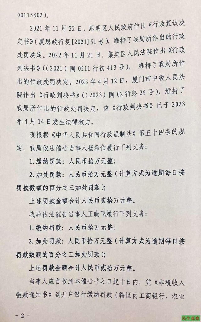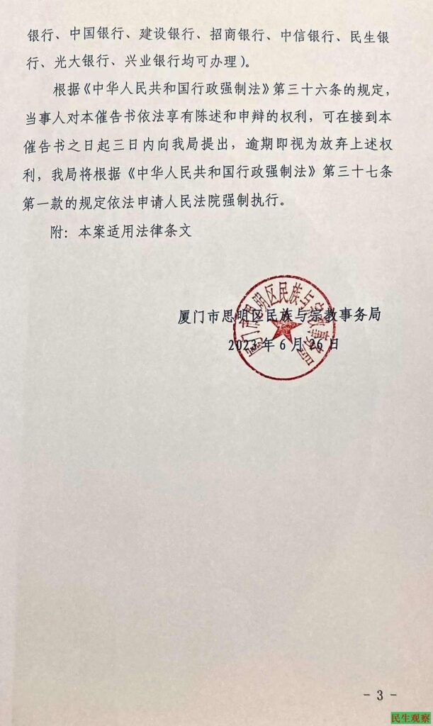 2023年6月26日,杨希伯夫妇收到了思明区宗教局的《行政处罚决定履行催告书》,夫妇俩被告知罚款已经从10万元加处到20万元,合计40万元。