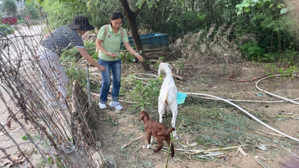 我们在村里喂羊妈妈和小黄羊宝宝。