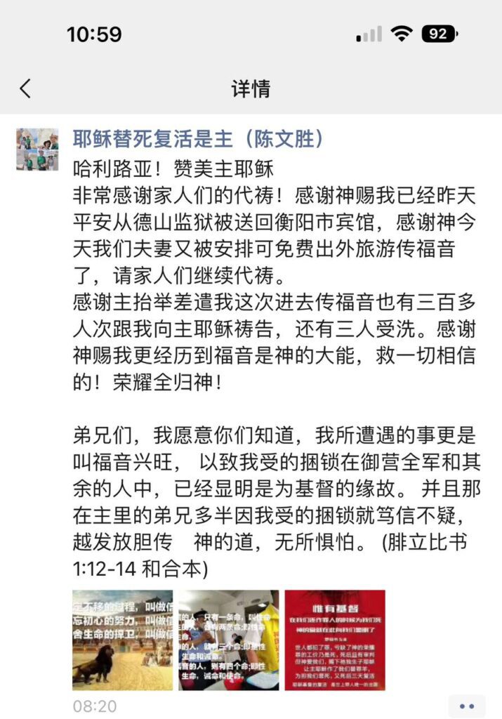 Thank you very much for your prayers! I thank God that I was sent back to Hengyang City Hotel from Deshan Prison yesterday, and I thank God that today we have been arranged to go on a free trip to preach the gospel, and I ask my family to continue to intercede for me.