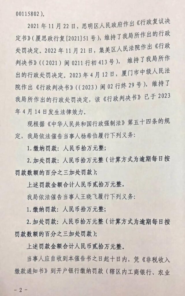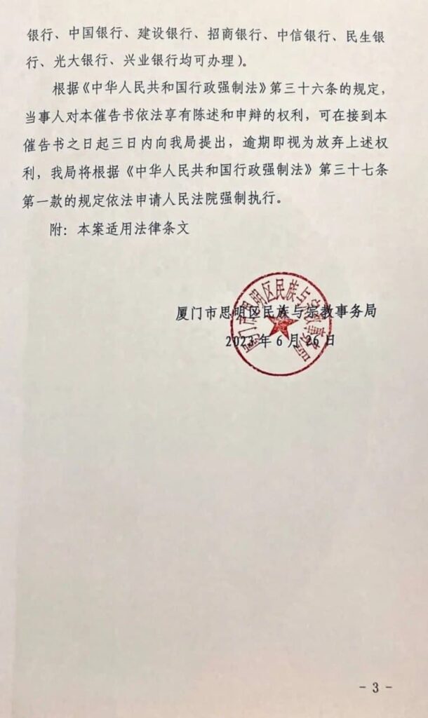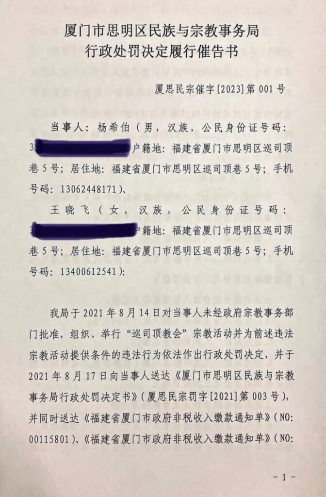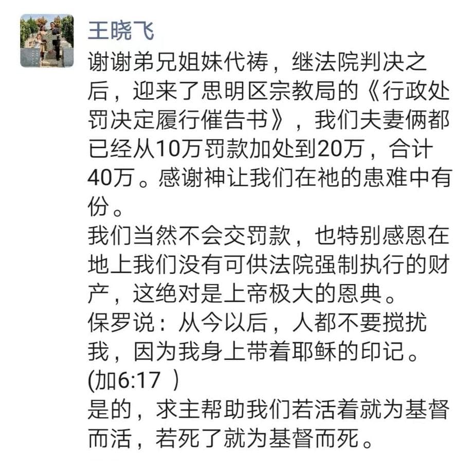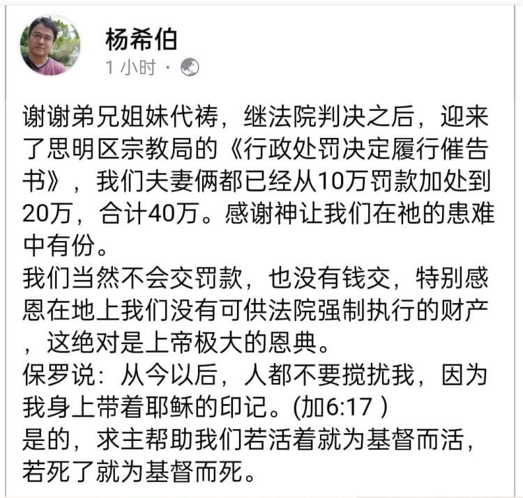 Thank you, brothers and sisters, for your prayers. Following the court’s verdict, we received a “Notice of Enforcement of Administrative Penalty Decision” from the Siming District Religious Affairs Bureau. The fines for my spouse and I have been increased from 100,000 to 200,000 each, totaling 400,000. We thank God for allowing us to share in His sufferings.